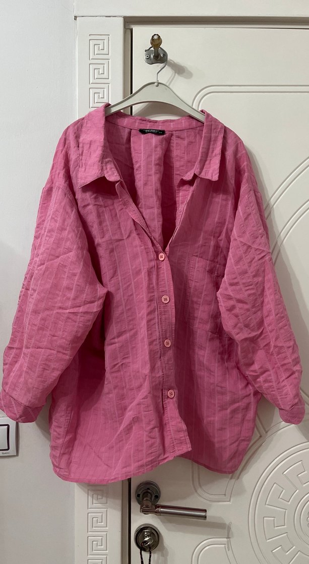 Pembe keten gömlek, düğmeli, uzun kollu ve notlu yaka detaylıdır. Salaş kesimi ve bohem tarzıyla günlük kullanıma uygundur.