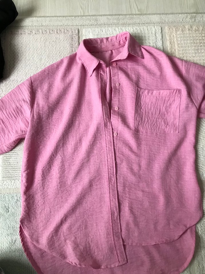 Düğmeli ön cep detaylı yakalı, keten kumaştan, kısa kollu, bol kesim pembe gömlek. Normal boyda, günlük kullanıma uygundur.