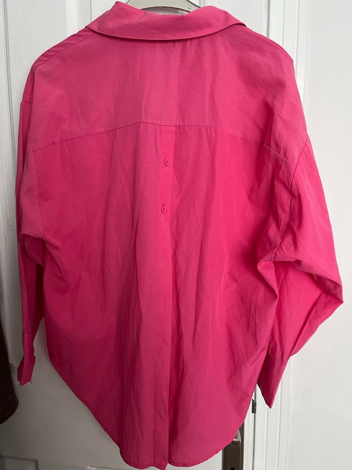 Düğmeli, uzun kollu, V yaka, parlak pembe keten kumaştan bol kesim kadın gömlek. Günlük kullanıma uygun.