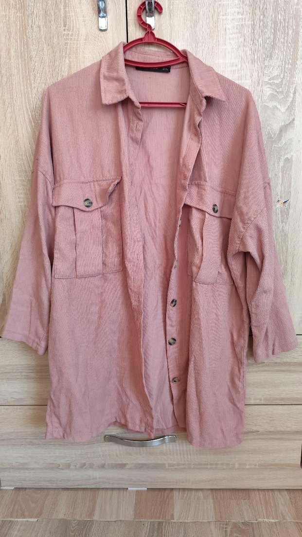 Pembe keten kumaştan, düğmeli ve uzun kollu, notched lapel yakalı, bol kesim kadın gömleği. Günlük rahat kullanım için uygundur. kadın gömlek az kullanıldı bir yerinde ip kaçması var fotoğrafta belirttim başka bir sorunu yok marka temsili
