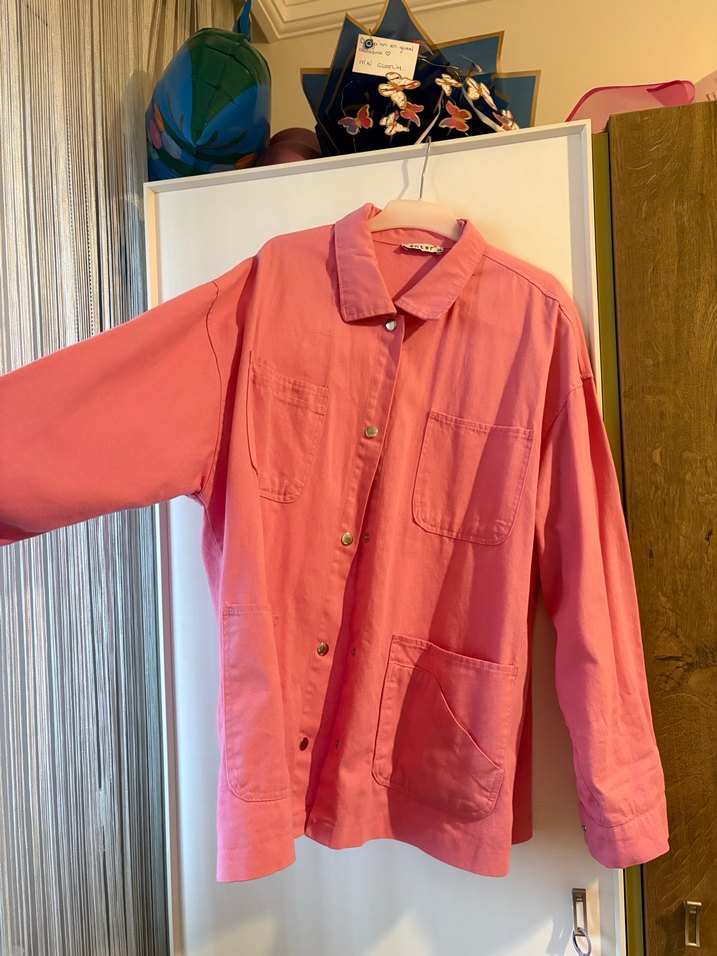 Düğmeli, uzun kollu, keten pembe gömlek. Rahat kesim ve normal boyda, gündelik kullanım için uygun.