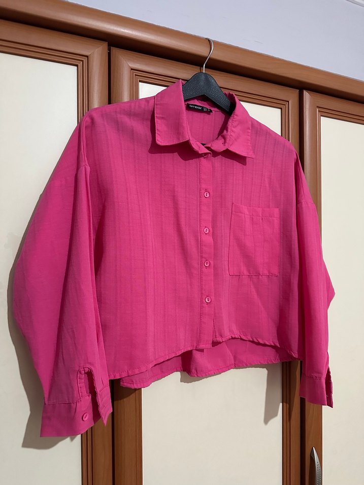 Düğmeli, uzun kollu, yakalı pembe keten gömlek. Salaş kesim ve kısa boyuyla günlük kullanıma uygun rahat bir tarz sunar. Hiç giyilmedi