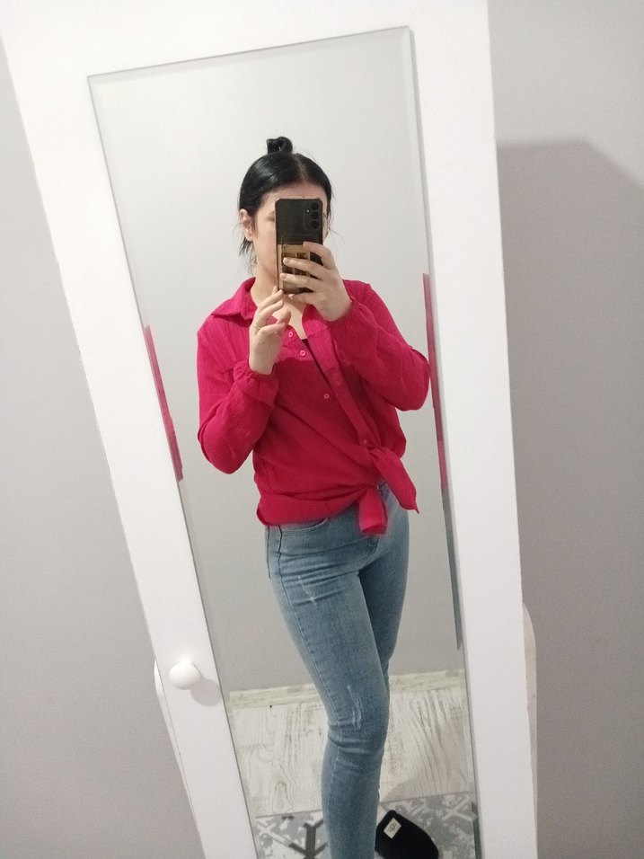 Düğmeli, uzun kollu, keten kumaştan yapılmış, normal boy pembe kadın gömleği. Notlu yaka ve bol kesimle günlük kullanıma uygundur.