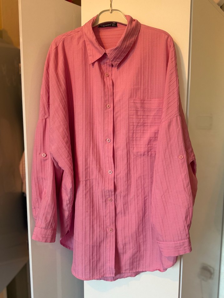 Düğmeli, uzun kollu, yakalı ve cep detaylı pembe keten kadın gömlek. Bol kesimiyle rahat bir şehir stili sunar.
