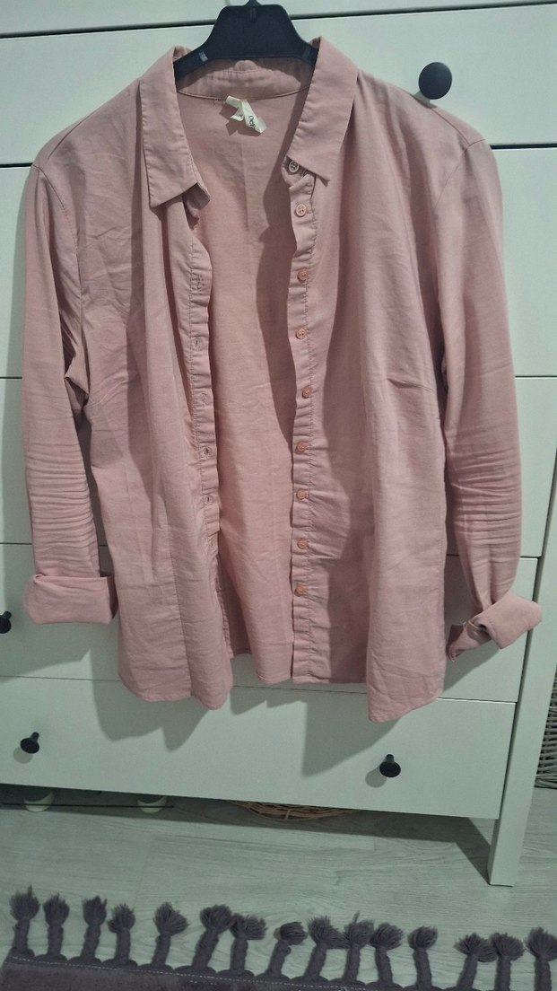 Düğmeli, yakalı, uzun kollu, bol kesim pembe keten gömlek, günlük kullanıma uygundur.
