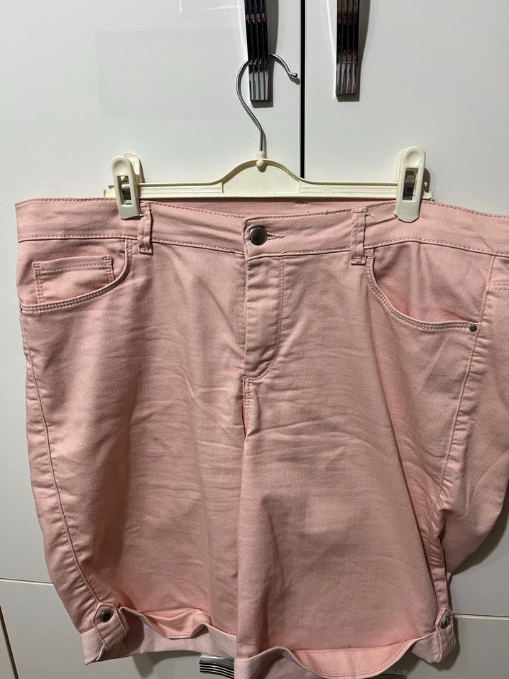 Düğmeli, midi boy, bol kesim pembe keten kadın pantolon. Günlük kullanıma uygun, rahat ve trend bir görünüm sağlar.