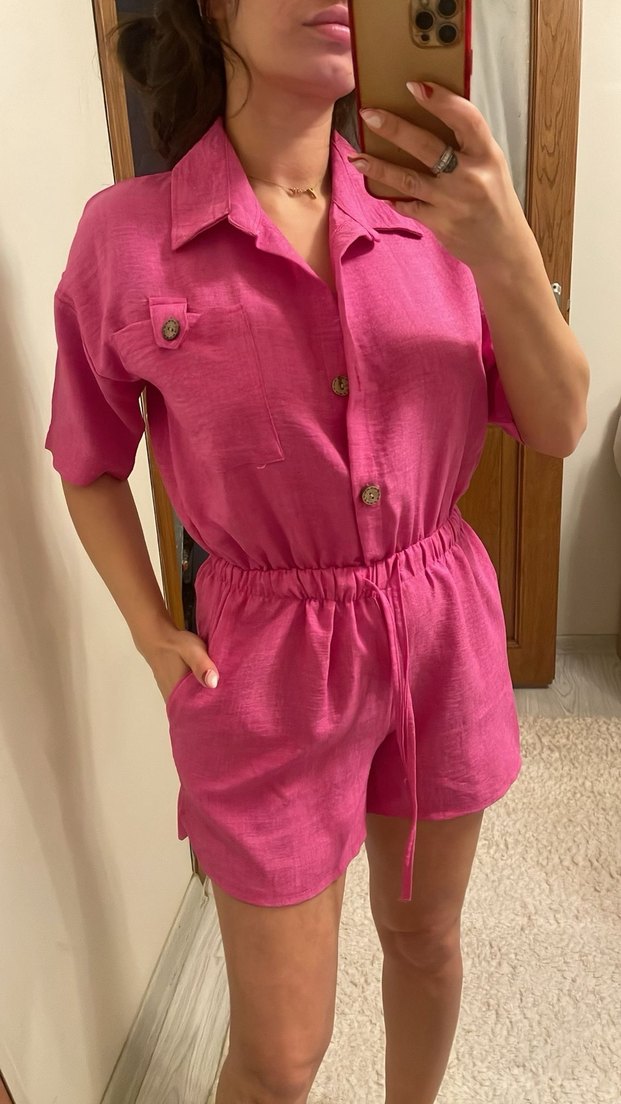 Pembe keten mini tulum, düğmeli ön, kısa kollu ve yakalıdır. Bol kesim, lastikli bel ile rahat sokak stili için uygundur.
