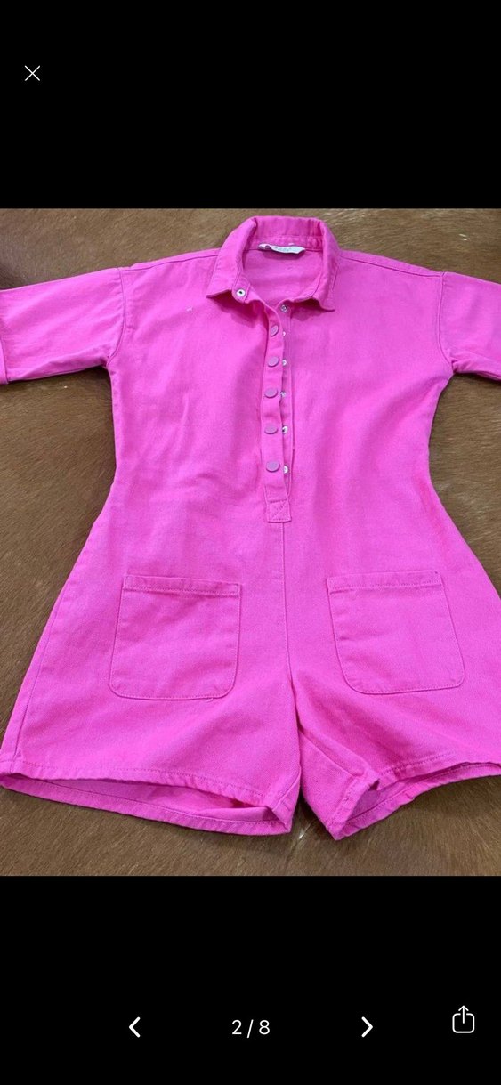 Düğmeli, yakalı, kısa kollu, bol kesim pembe keten mini tulum. Günlük kullanıma uygun, bohem tarzda rahat bir parça.