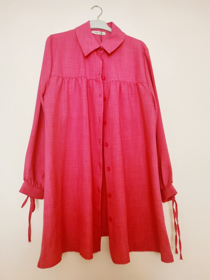 Pembe keten b uzun kollu, düğmeli ve bol kesimdir. Bohem tarzı ve tek renkli, günlük hiç giymedim 42 den 46 ya uygun