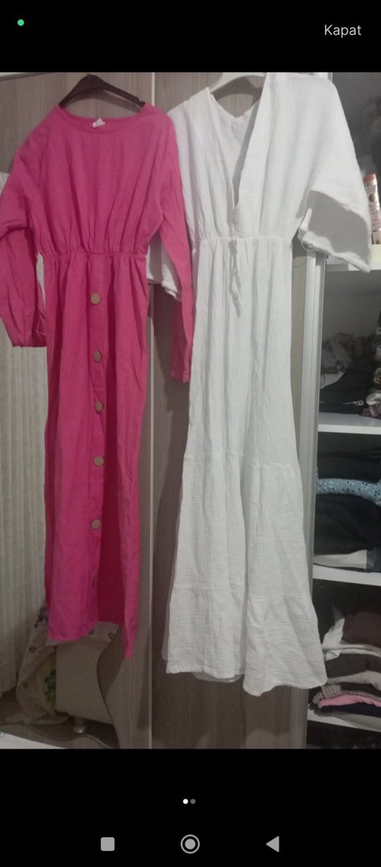 Düğmeli, uzun kollu, straplez kesim pembe keten kumaştan, bol kesim uzun elbise. Bohem tarzı ve minimalist dokunuş içerir.