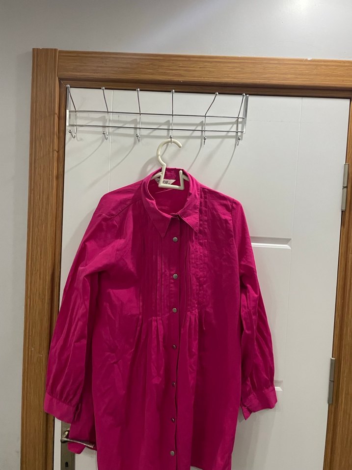 Parlak pembe keten gömlek, düğmeli ve yakalıdır. Uzun kollu, midi boy ve bol kesimdir. Minimalist bohem tarzına uygun, günlük kullanıma uygundur. Koli 6