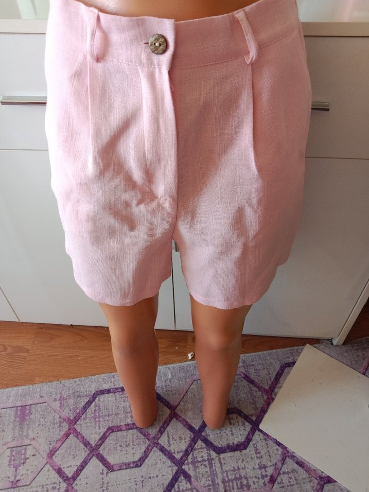 Pastel pembe keten kumaştan yüksek bel mini şort, düğmeli ve bol kesim olarak rahat bir görünüm sunar. Günlük kullanım için uygundur.