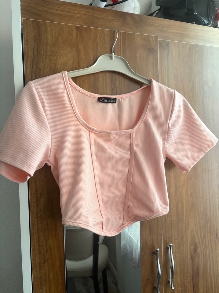 Pastel pembe renkli, kısa kollu, yuvarlak yaka, düğmeli ve mini uzunlukta, sentetik yumuşak kumaştan crop top.