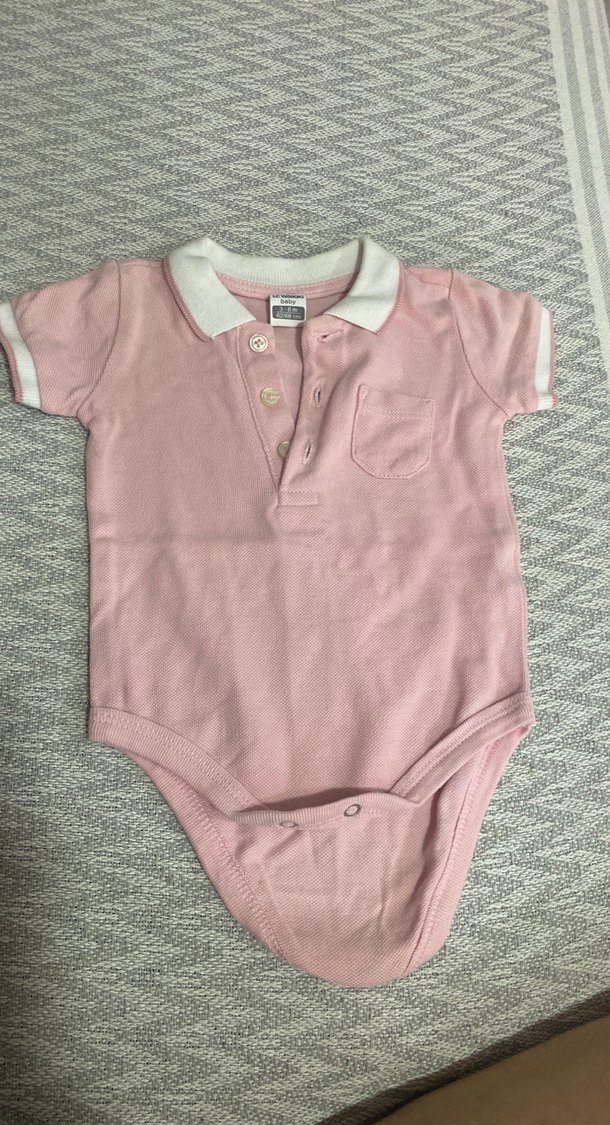 Pastel pembe renkte, düğmeli, kısa kollu, yakalı bebek body. Küçük göğüs cebine sahiptir.