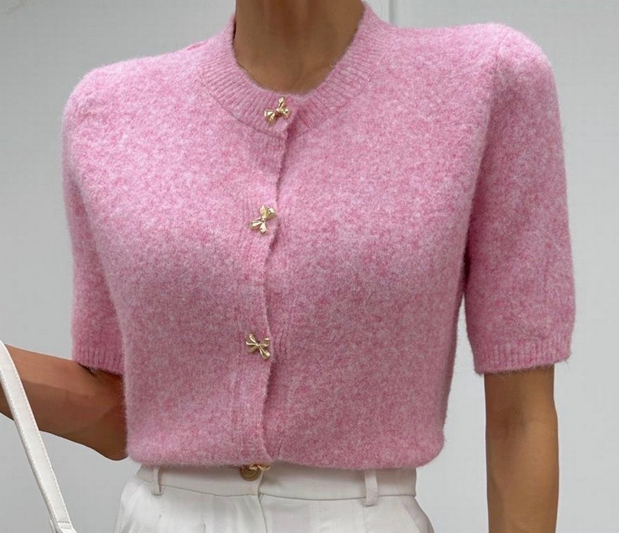 Fitted kesim, crew neck ve kısa kollu pembe örme hırka, şık fiyonk düğmelerle. Modern klasik tarzda, günlük kullanıma uygun.