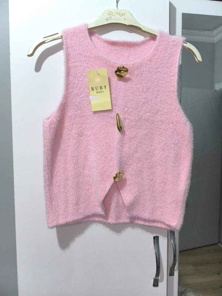 Düğmeli, yuvarlak yakalı, pembe triko yelek. hiç kullanılmadı sıfır ürün