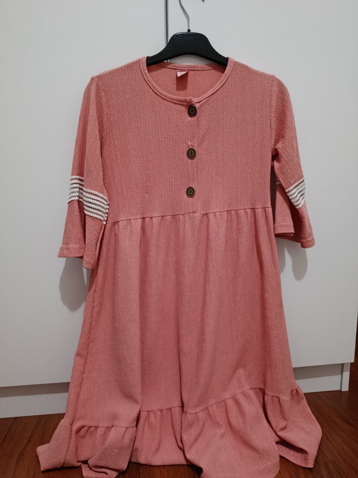 Pembe pastel renkte, düğmeli ve kısa kollu kız çocuk bohem tarzı bol kesim elbise. Yumuşak sentetik kumaştan, bisiklet yaka ile.