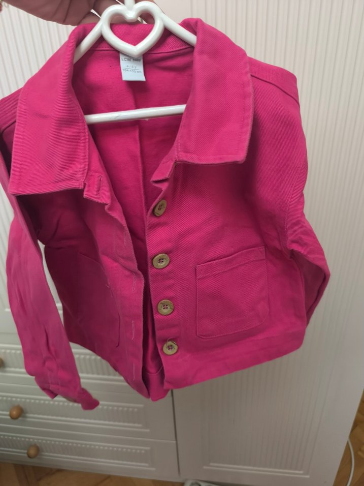 Düğmeli ve kesimli yakalı, suni kumaştan yapılmış pembe kız çocuk ceketi, sokak stili için uygundur.