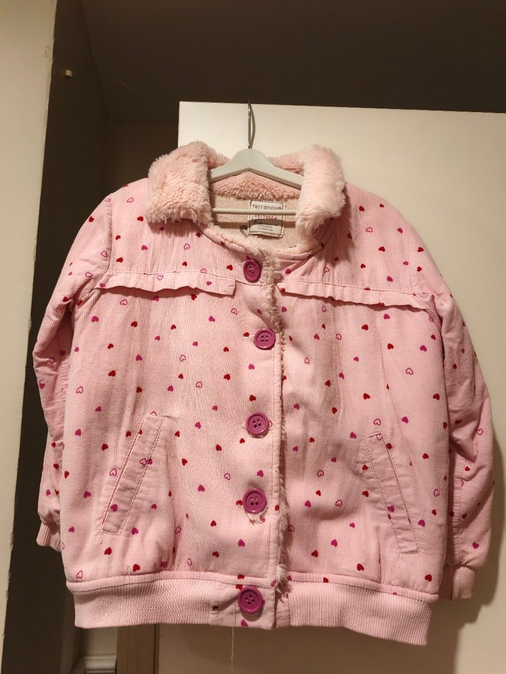Düğmeli, yakalı, kalp desenli, bol kesim pembe kız çocuk ceketi, rahat ve sıcak malzemeden üretilmiştir.