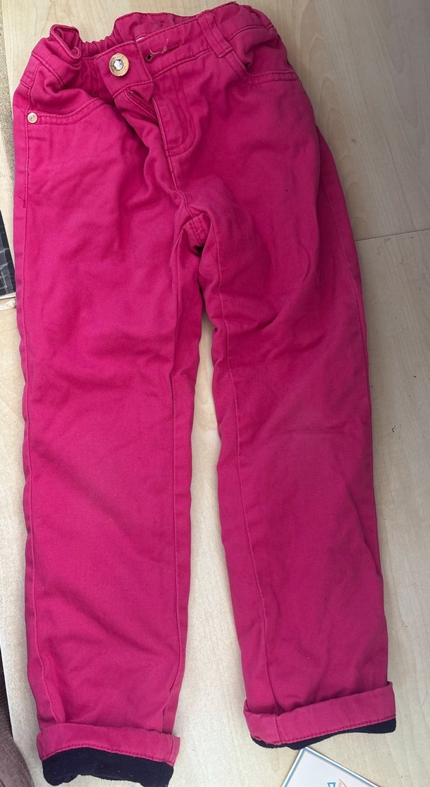 Düğmeli, dar kesim pembe kız çocuk pantolonu. Sentetik kumaştan üretilmiş, renkli ve trend sokak giyimine uygun.