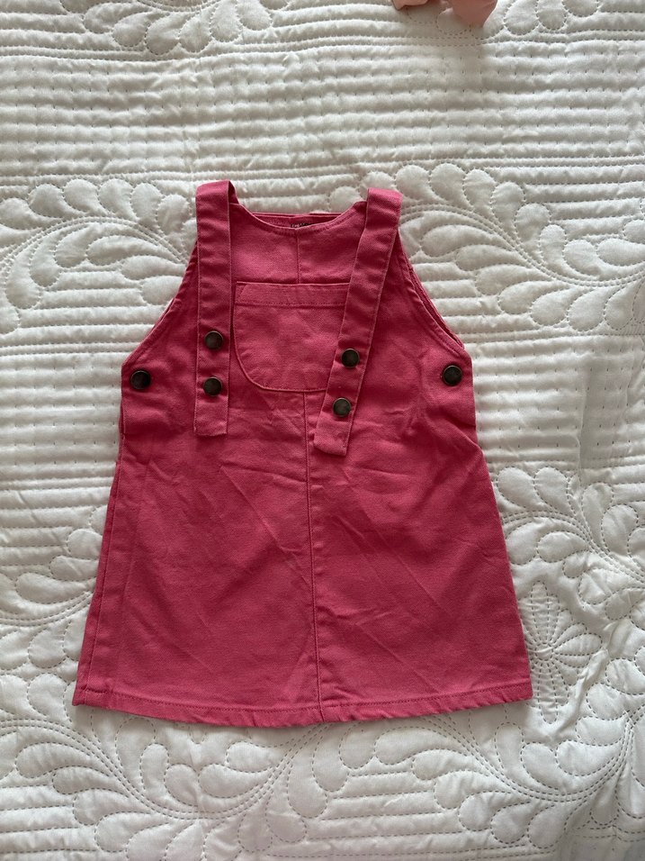 Kolsuz, düğmeli ve pembe renkli kız çocuk elbisesi, yumuşak dokulu kumaştan üretilmiştir. Straplez yakaya ve sade, bohem tarza sahiptir.