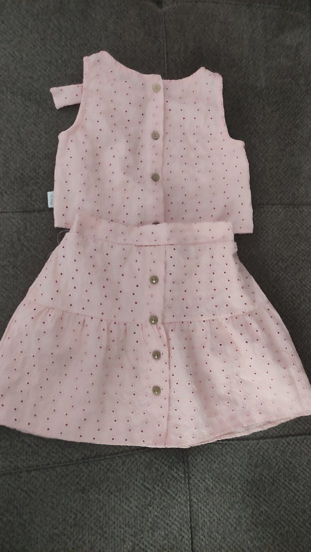 Düğmeli, işlemeli pastel pembe renkli kız çocuk elbise takımı. Kolsuz ve regular fit olarak tasarlanmıştır.