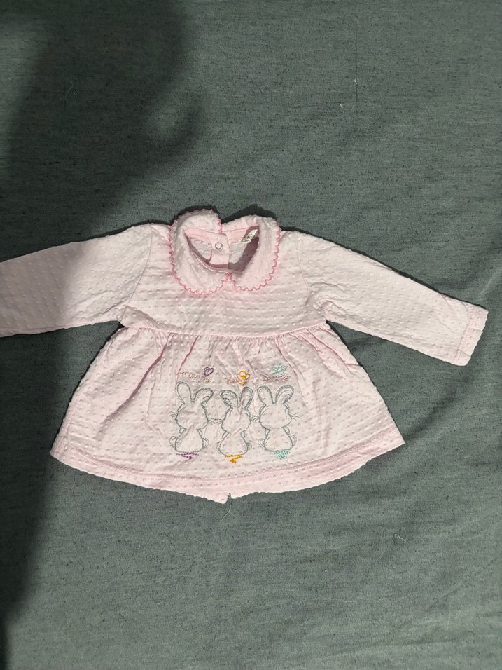 Düğmeli, V yakalı, bol kesim kız bebek elbisesi Yumuşak ve sıcak pembe kumaştan, sade ve temel tarzda. Bir kaç kez giyildi çok şirim bir ürün 2-4 ay aralığına olabilir