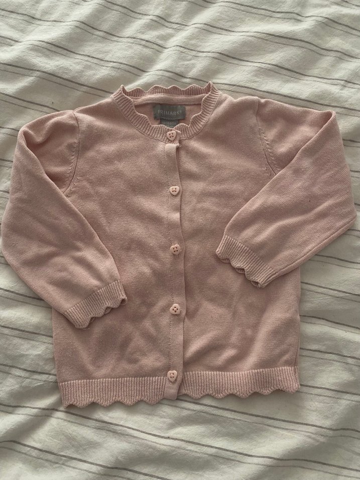 Düğmeli, uzun kollu, pastel pembe renkli, ince örgü kız çocuk hırkası. Sade ve desensiz tasarımıyla günlük kullanıma uygundur. 12.18 aylık temiz defosuz primark marka