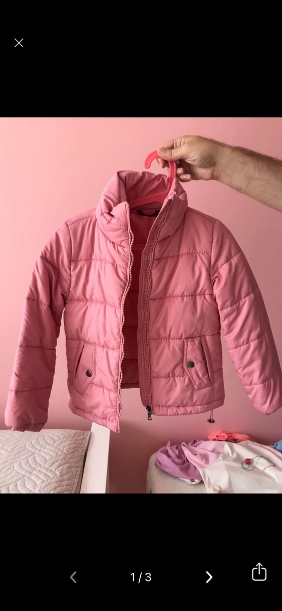 Düğmeli ve yakalı, pembe kız çocuk montu, yumuşak ve sıcak kumaştan, pastel sokak stili, desensiz.