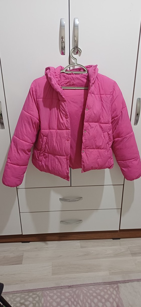 Düğmeli ve kısa kesim pembe mont, yumuşak ve sıcak kumaştan üretilmiştir. Rahat ve şık sokak stili için uygundur.