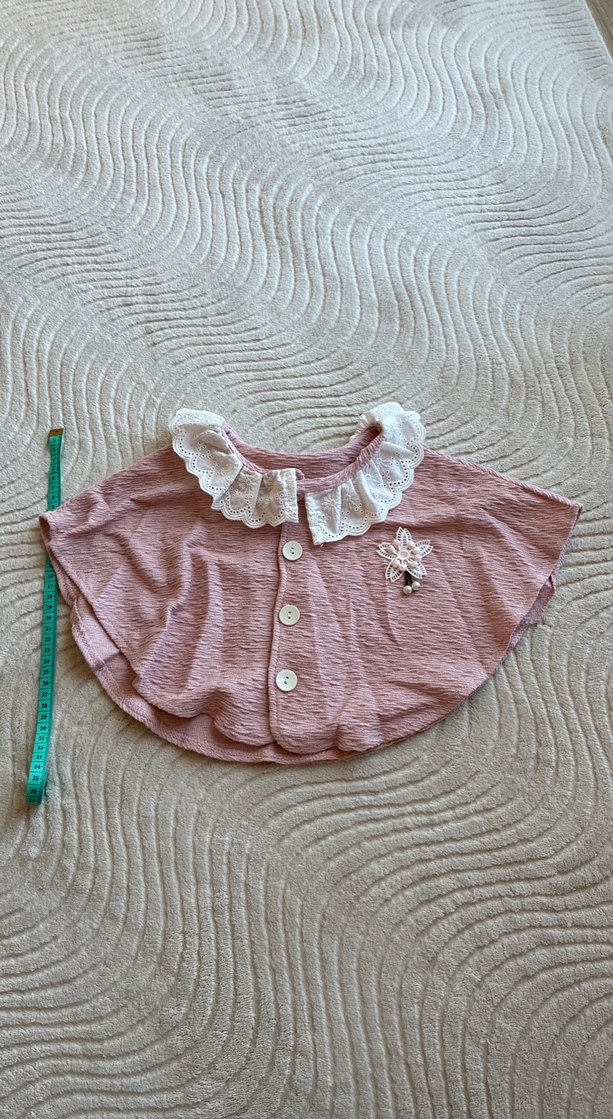 Düğmeli, yakası dantelli, kısa kollu, pembe renkli kız çocuk ponçosudur. Nakış detayları ve bol kesimi vardır.