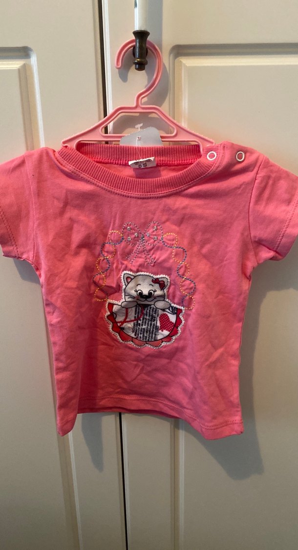 Düğmeli, kısa kollu, bisiklet yaka, renkli baskılı pembe kız çocuk tişörtü. Streetwear tarzında, tekstil kumaştan üretilmiştir.