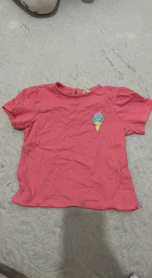 Pamuk kumaştan yapılmış, kısa kollu, yuvarlak yaka, düğmeli ve küçük dondurma baskılı rahat kesim kız çocuk tişörtü.