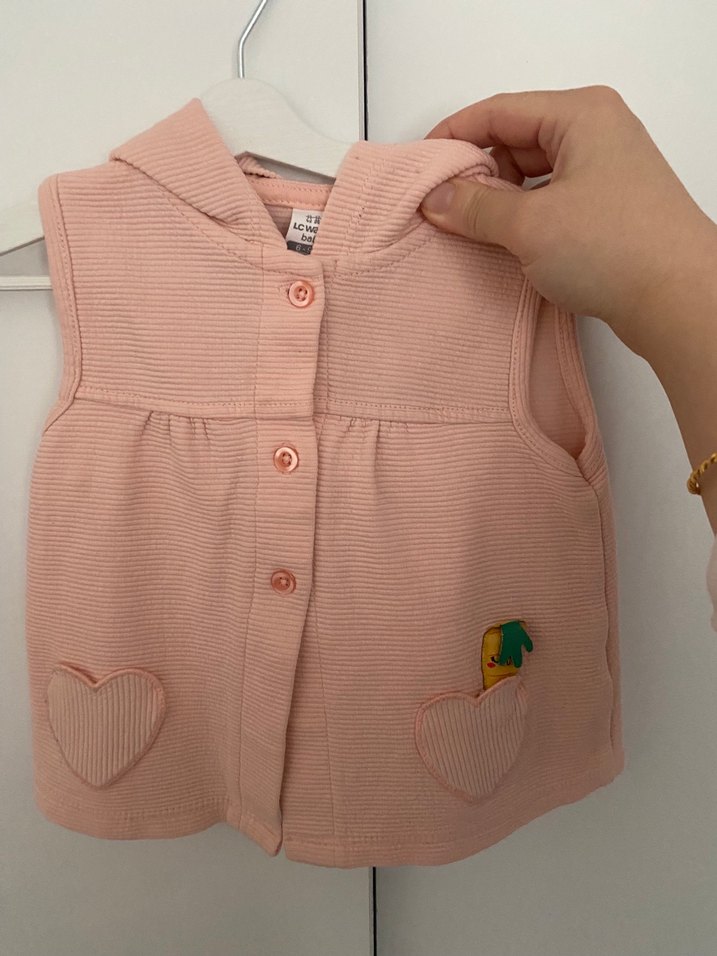 Düğmeli, yakalı ve kolsuz pembe triko yelek, işlemeli kalp cepleriyle trend görünüyor. Rahat ve şık bir tercih.