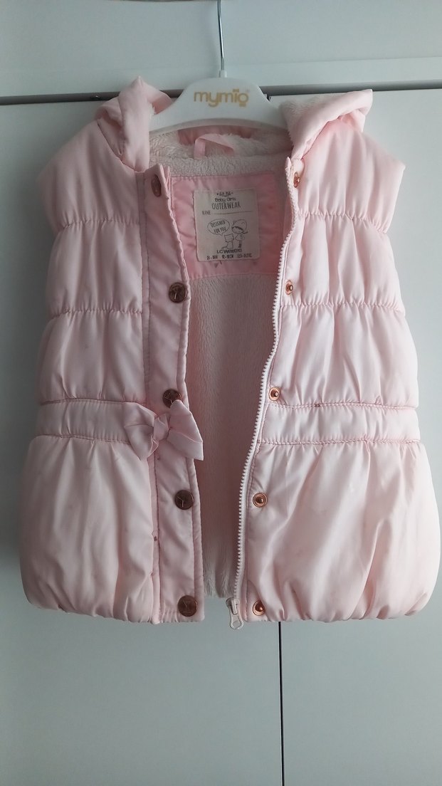 Düğmeli, kolsuz kız çocuk yeleği, pastel pembe renkte, çıtçıtlı ve notalı yaka detaylıdır. Yumuşak ve sıcak kumaştan yapılmış, sade tasarımlıdır.