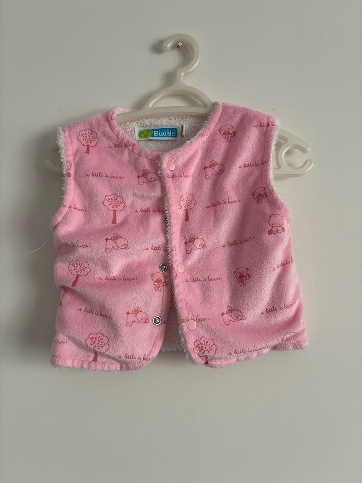 Düğmeli, straplez yakalı, pastel pembe renkli, baskılı ve fit kesimli kız çocuk yeleği. Yumuşak ve sıcak dokusu ile rahat kullanım sağlar. Sıfır