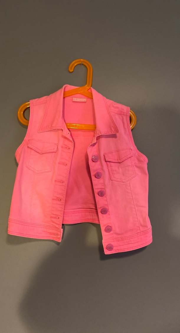 Düğmeli, önü açık, yakası kesik, pembe kot kumaştan, kızlar için dar kesim yelek.
