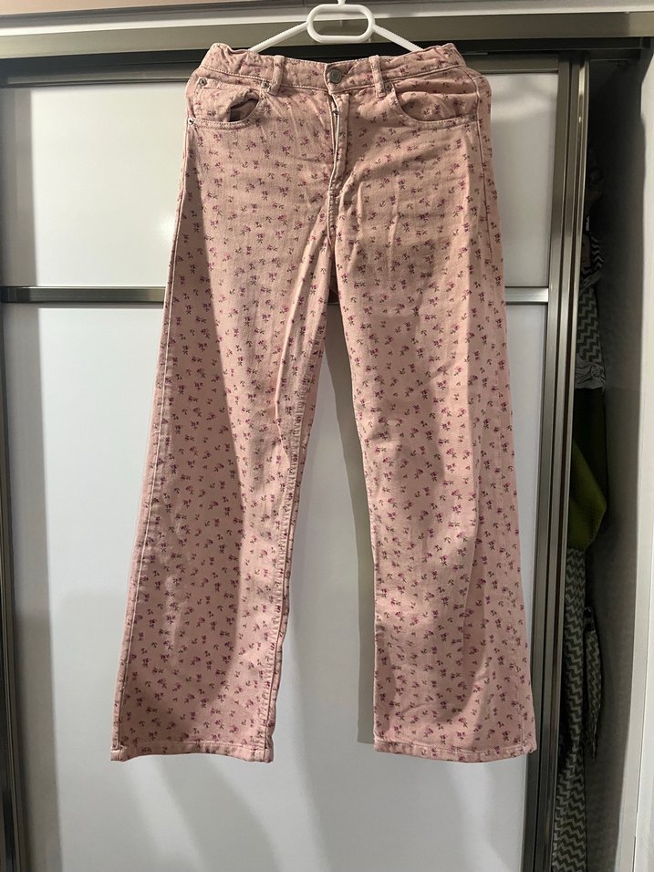 Yumuşak dokulu tekstil kumaştan, düğmeli, hafif desenli, bol kesim pembe kız pantolonu, trend casual tarz için uygun.