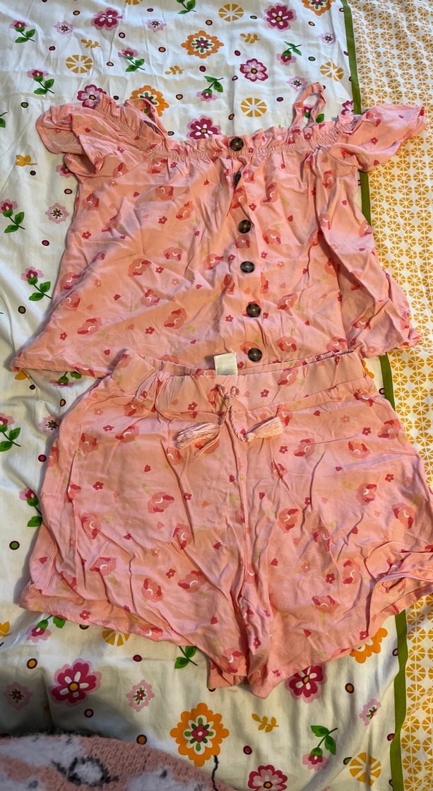 Düğmeli, kısa kollu, pembe tonlarında takım. hiç giyilmedi. etiketi yok.