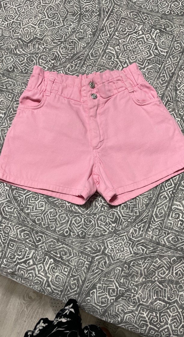 Düğmeli, pamuklu, pembe renkli rahat kesim kız şortu, günlük sokak tarzına uygun.
