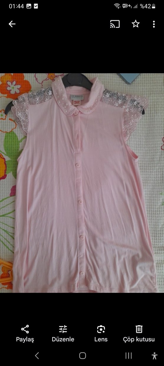 Pamuk kumaştan üretilmiş, düğmeli ve yakalı pembe kolsuz bluz. Omuzlarda dantel detayları bulunan, rahat kesimli günlük kullanıma uygun bluz.