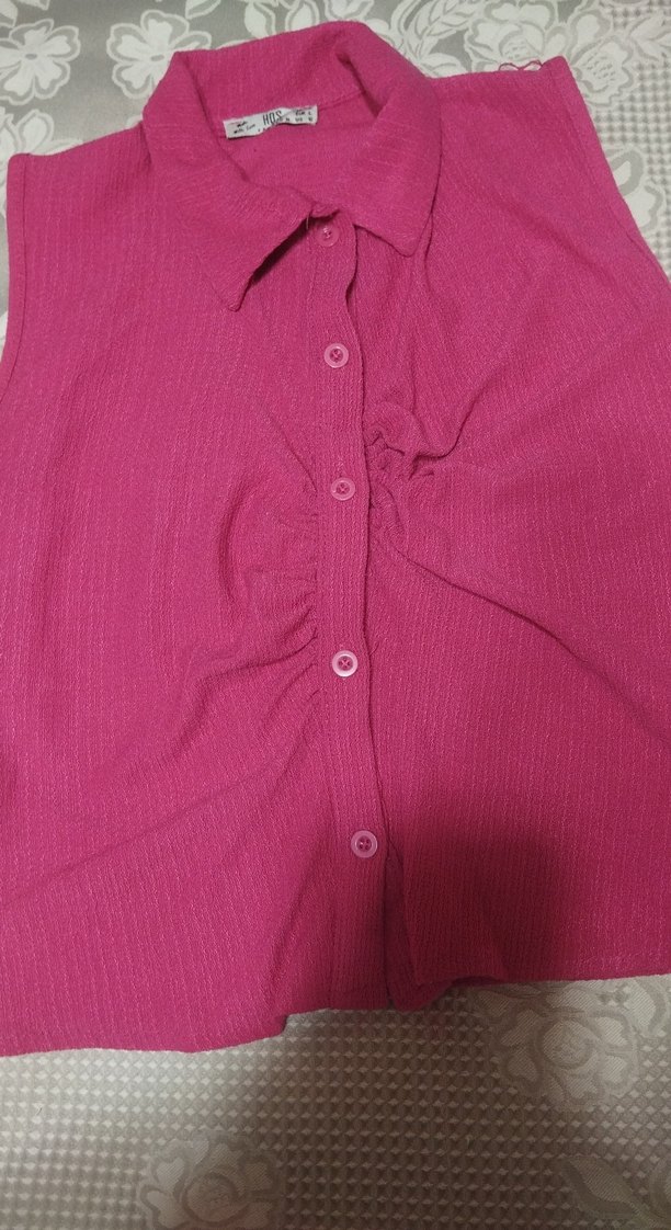 Düğmeli önü ve yakalı, kolsuz pembe keten gömlek, günlük rahat kullanıma uygundur.