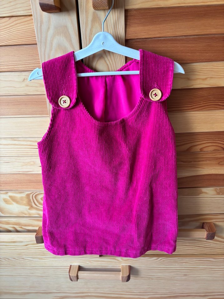 Yumuşak tekstil kumaştan, düğmeli askılı, salaş kesim ve yuvarlak yakalı pembe maşa elbisesi 1 kez giyildi