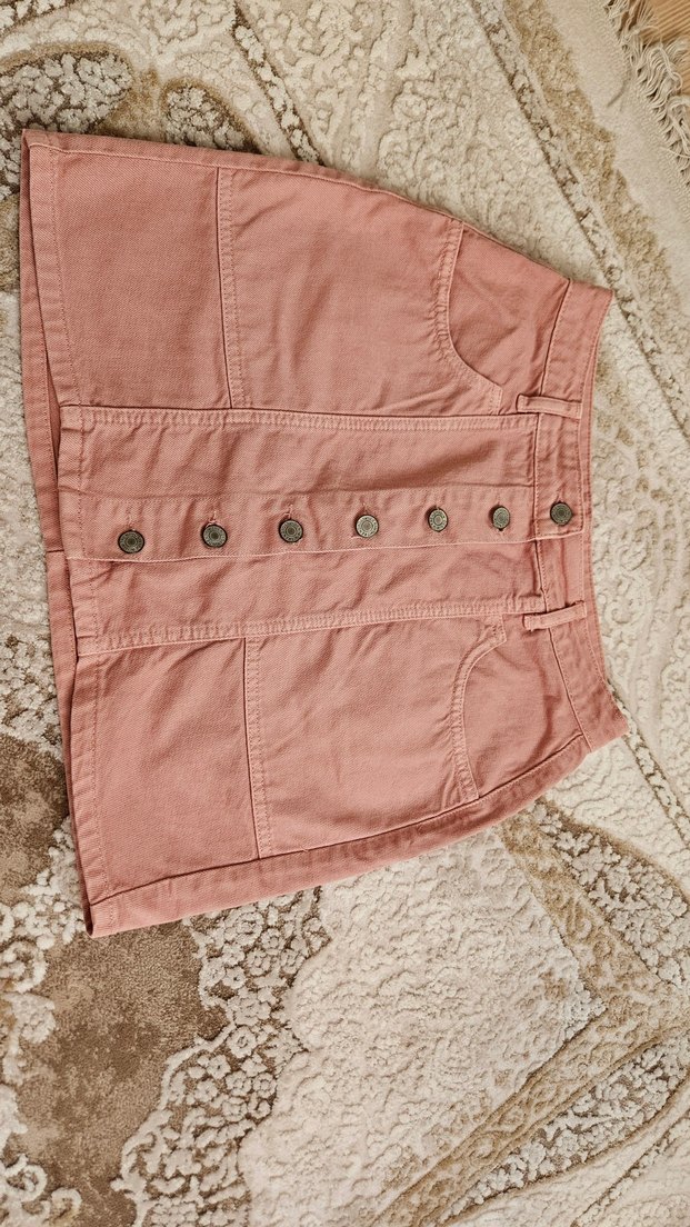 Düğmeli Pembe Kot Mini Etek