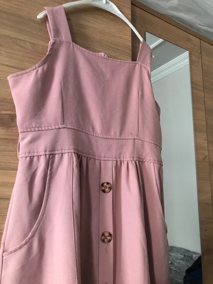 Düğmeli Pembe Midi Askılı Elbise