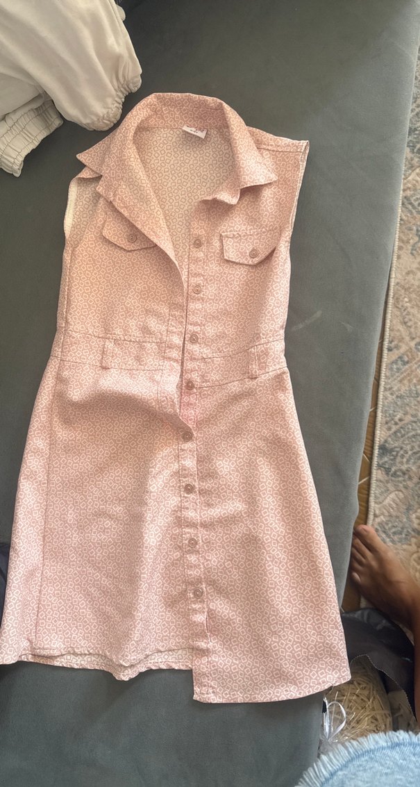 Düğmeli, yakalı ve kolsuz pembe midi elbise, vücuda oturan kesimiyle günlük sokak stiline uygun.