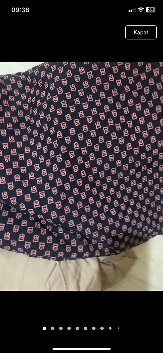 Düğmeli, baskılı desenli koyu pembe midi hamile eteği. Sentetik kumaştan, bol kesim ve günlük sokak tarzına uygun.