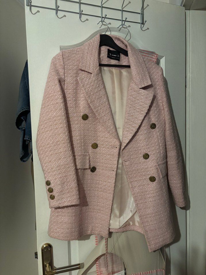 Pastel pembe renkli, düğmeli midi blazer. Notch yakalı, uzun kollu ve rahat kesim. Günlük kullanıma uygun yumuşak sentetik kumaştan.