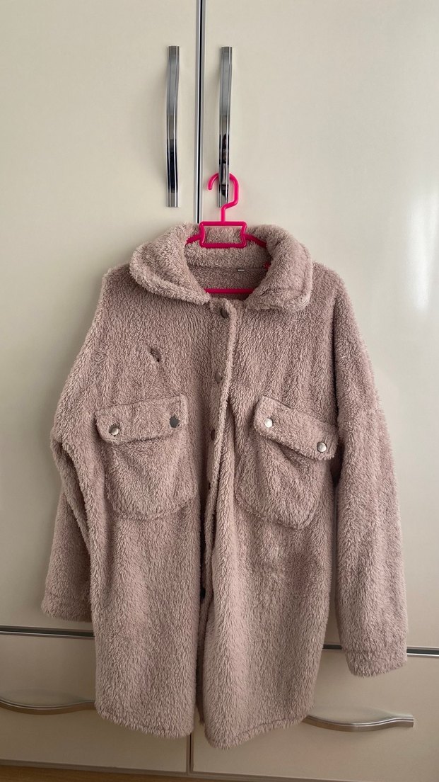 Pembe midi ceket, yumuşak ve rahat kumaştan, uzun kollu ve düğmeli. Notlu yakası ve cep detaylarıyla salaş bir görünüm sunar.