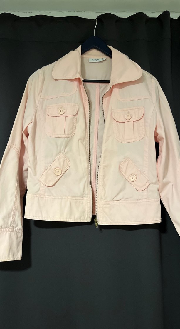 Pembe, düğmeli cepleri ve ön düğmeleri olan, uzun kollu, yakalı, normal midi uzunlukta, sentetik kumaştan yapılmış kadın ceketi. Günlük kullanıma uygundur. Gerçekte daha koyu bir pembedir